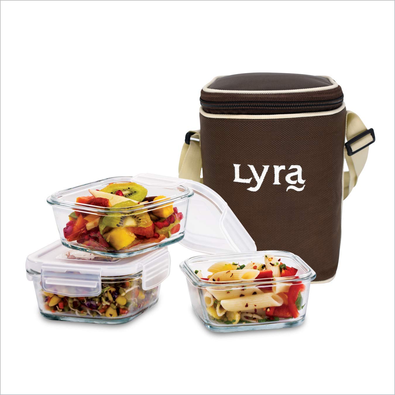 Lyra Clip N Store Square Microwavable Glass Lunch Container with Lunch Bag, 375ml, Set of 3, Clear/Brown Price: ₹ 691.00